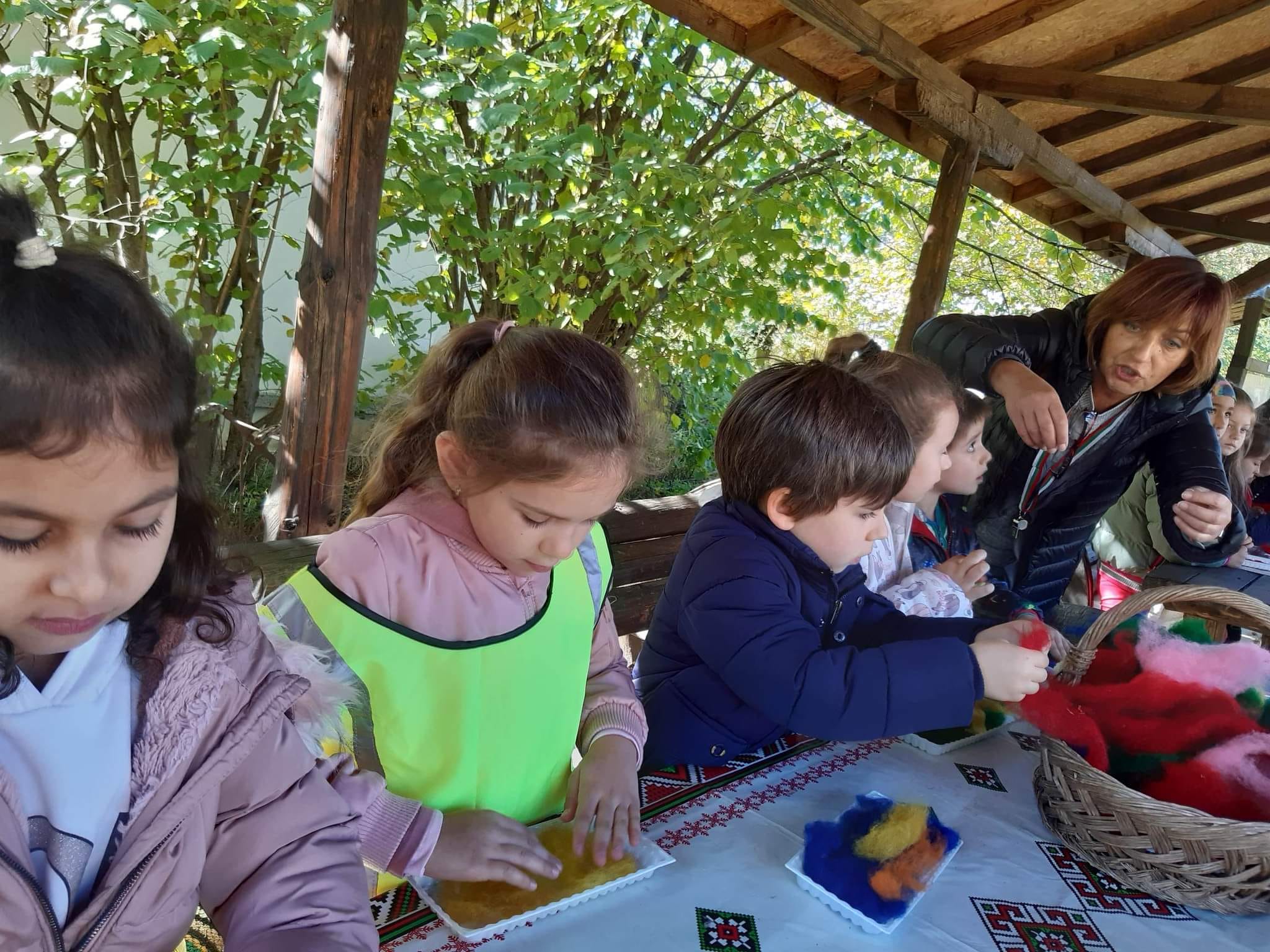 „Любезните домакини от комплекс „Боженски чифлик“ направиха демонстрация и дадоха възможност на децата да експериментират мократа техника на плъстене, която е процес на оплитане на вълнените нишки една в друга. При тази техника първо се разстилат слоеве вълна върху навлажнен найлон, после тя се полива с топла сапунена вода. След това с многократни почуквания с пръсти вълната се обработва, докато се сплъсти. При натиск с ръце и благодарение на топлината и сапуна тя много бързо се превръща във филц. Всички деца имаха възможността да изработят собствен модел на декорация, прилагайки творчество и въображение“, споделя още директорката на ДГ „Ран Босилек“.