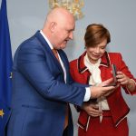 Министър Цоков връчва почетен плакет на МОН на доайена на българската общност в Румъния и председател на Демократичния съюз на българите Лука Велчов за родолюбивата му дейност. ”Това е знак и за трудолюбието на банатските българи, защото там съм пораснал, там съм се възпитал. В Банат. Отечеството трябва да е на първи план за нас. Често го пренебрегваме”, споделя Велчов.