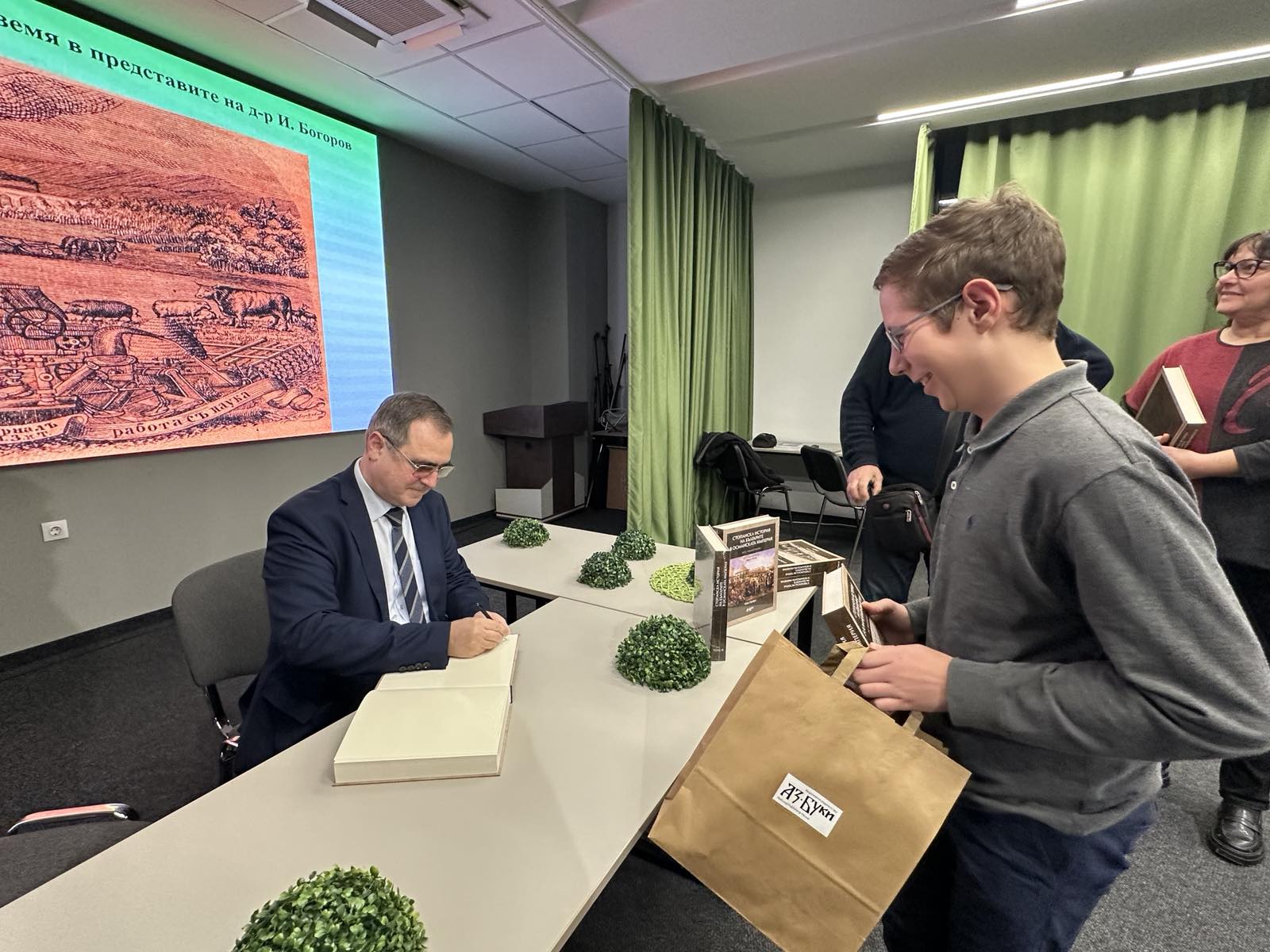 Сред гостите на премиерата в Бургас бе и осмокласникът Божидар Тодоров, който е ученик в ППМГ „Акад. Никола Обрешков“. „Доведе ме големият ми интерес към стопанската историята на България, която е един от най-интересните дялове на българското минало“, сподели той. Миналата година Божидар се класира първи на националния кръг на XVIII национална олимпиада по история и цивилизации, която се проведе във Варна.