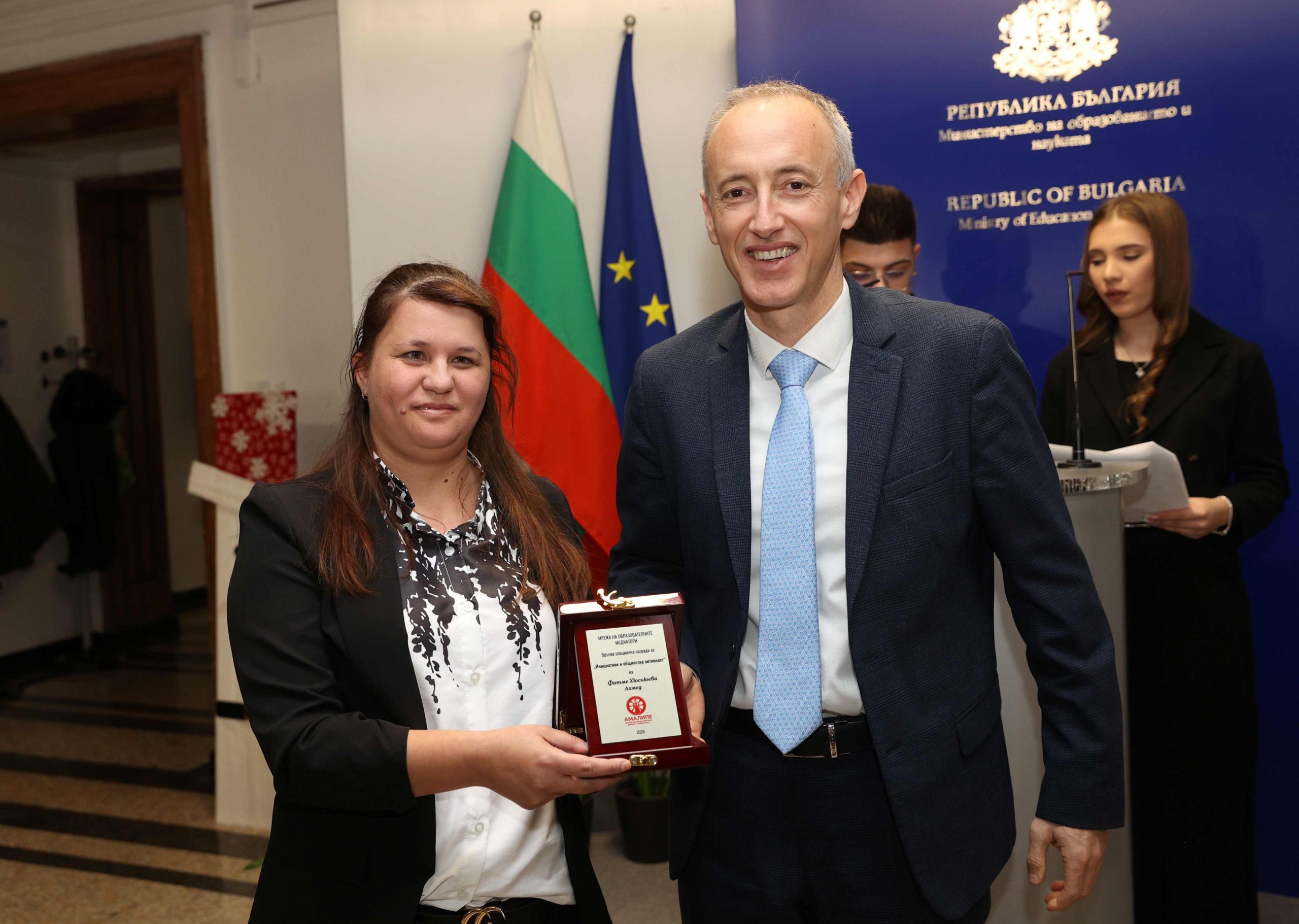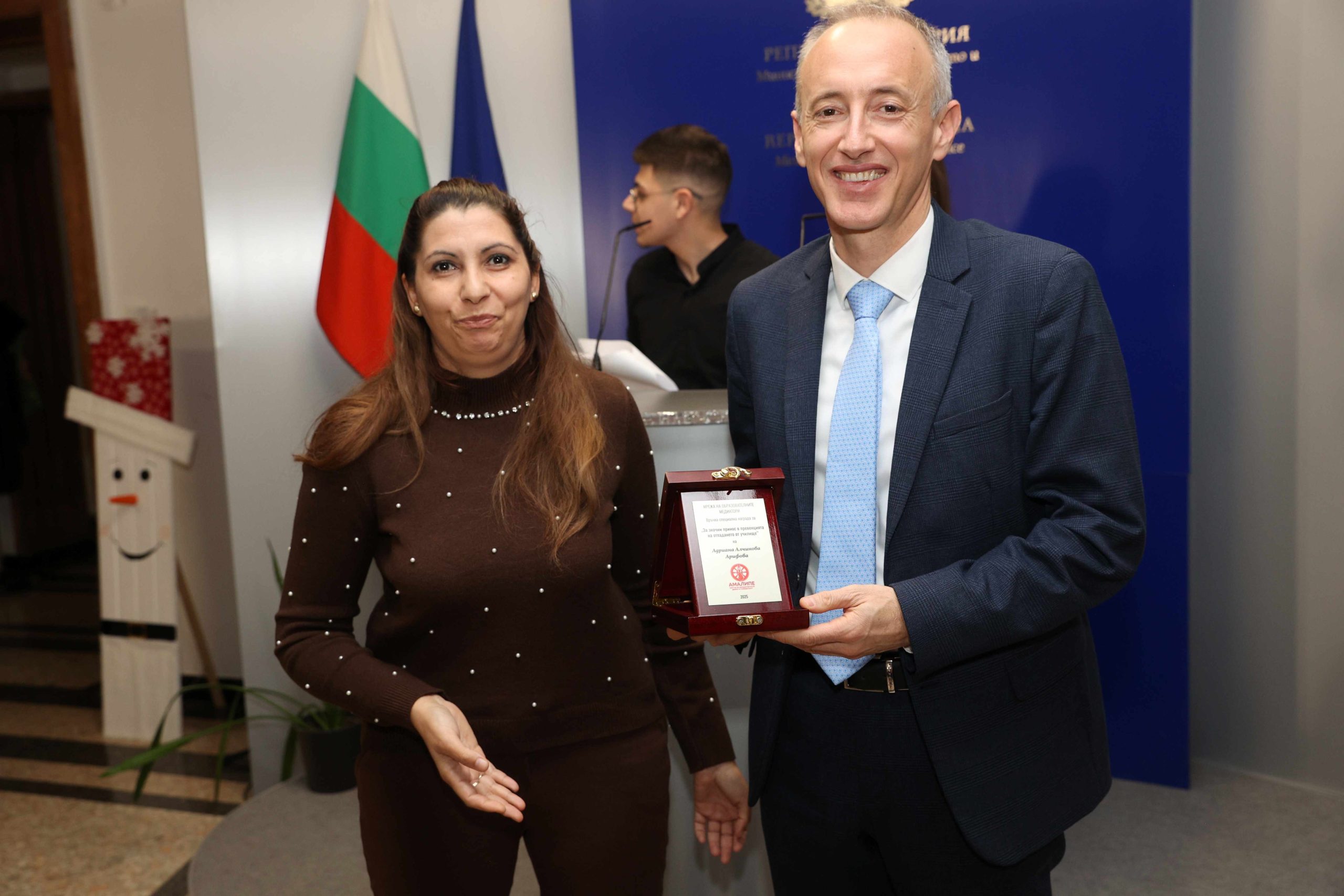 Емилия Енчева от СУ „Йордан Йовков“ в Тутракан получи наградата в категорията „За принос, иновации, устойчивост в ромска общност“, а Нанси Нанева от НУ „Св. св. Кирил и Методий“ в Тополовград – тази за „Млад медиатор“ за 2025 г.