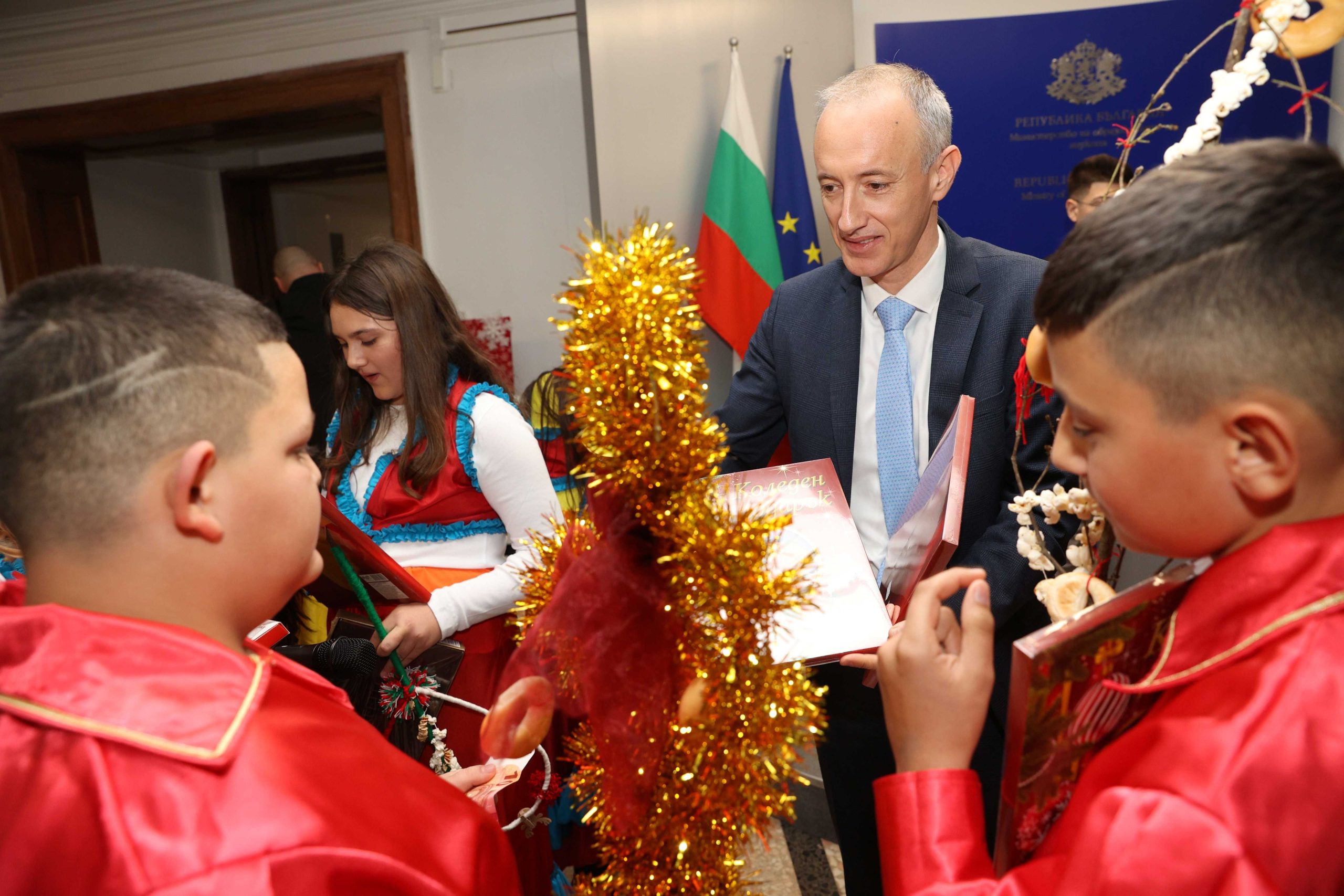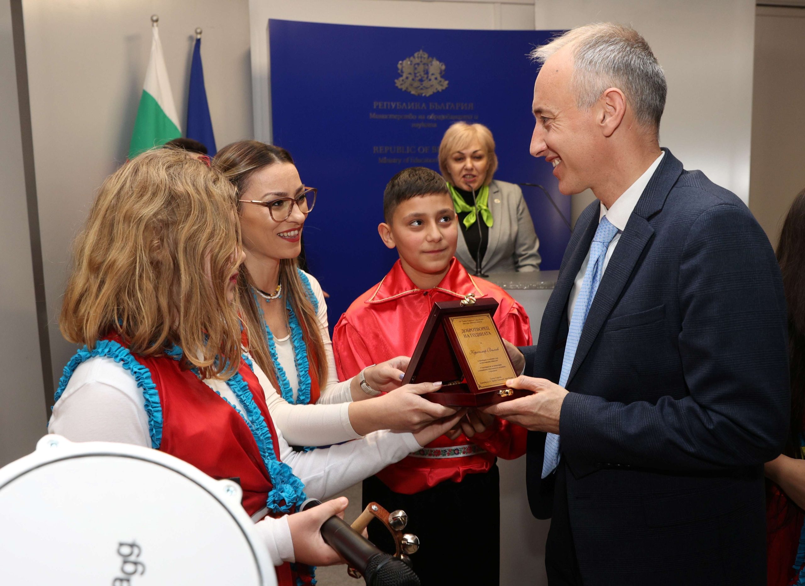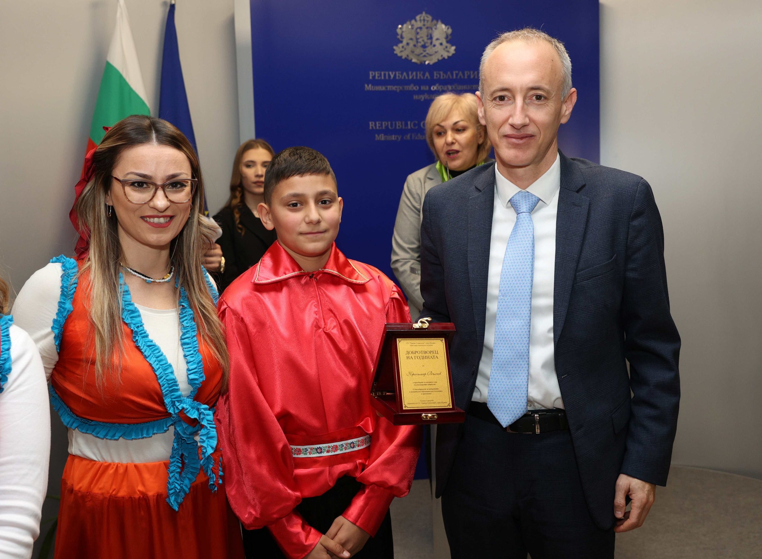 Министър Красимир Вълчев пък получи отличието „Добротворец на 2025 г.“. Наградата му бе връчена от директора на СУ „Трайко Симеонов“ в Шумен – Галина Сакарова.