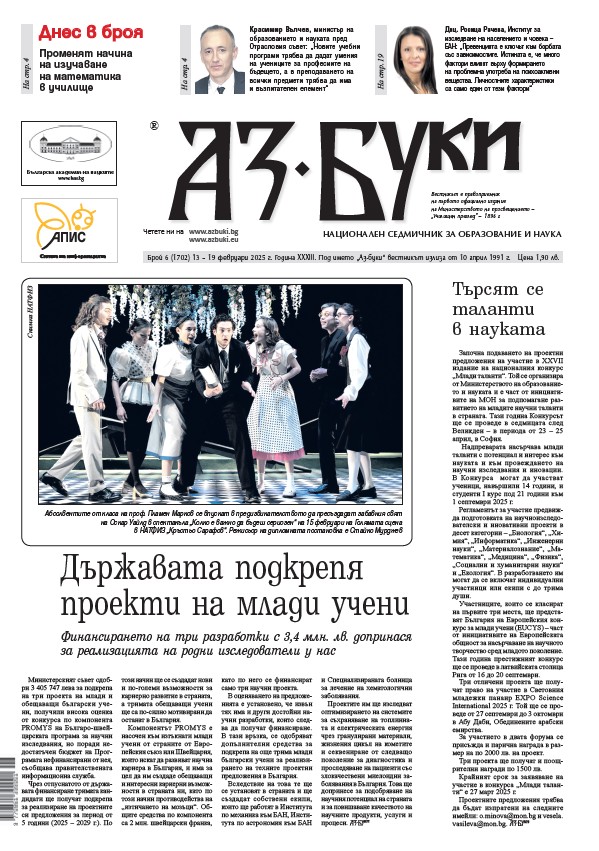 <h4><a href="https://azbuki.bg/wp-content/uploads/2025/02/azbuki-6-2025.jpg"><img class=" wp-image-144923 alignleft" src="https://azbuki.bg/wp-content/uploads/2025/02/azbuki-6-2025.jpg" alt="" width="245" height="348" /></a>Четете в новия брой:</h4> - Държавата подкрепя проекти на млади учени - Рекорден брой сигнали за онлайн насилие над деца: Министерството на образованието и науката ще продължи сътрудничеството си с Националния център за безопасен интернет - Едно устойчиво партньорство: Пет центъра за образователни, социални и здравни услуги и обучения за 600 медиатори се финансират по Българо-швейцарската програма за сътрудничество - Наши гимназисти с награда от конкурс за космическа колония - Всяко дете намира своето място и значимост: ОУ „Св. св. Кирил и Методий“ в село Попица предлага разнообразни дейности на учениците - Образованието е право, а не привилегия: „Няма лоши деца, има родители, които не се справят“, казва медиаторът Минка Арнаудова от ПГСС „Гео Милев“ в Мъглиж - Час по любов ...с д-р Таня Илиева, специалист по педагогическа и възрастова психология и училищен психолог в 28. СУ „Алеко Константинов“ – София - Ректорите предлагат: Тригодишно обучение за медицински сестри [flipbook pdf="https://azbuki.bg/wp-content/uploads/2025/02/v.-az-buki-br.-6-2025.pdf"] <a href="https://azbuki.bg/wp-content/uploads/2025/02/v.-az-buki-br.-6-2025.pdf">Изтеглете</a> броя на вашeто устройство.